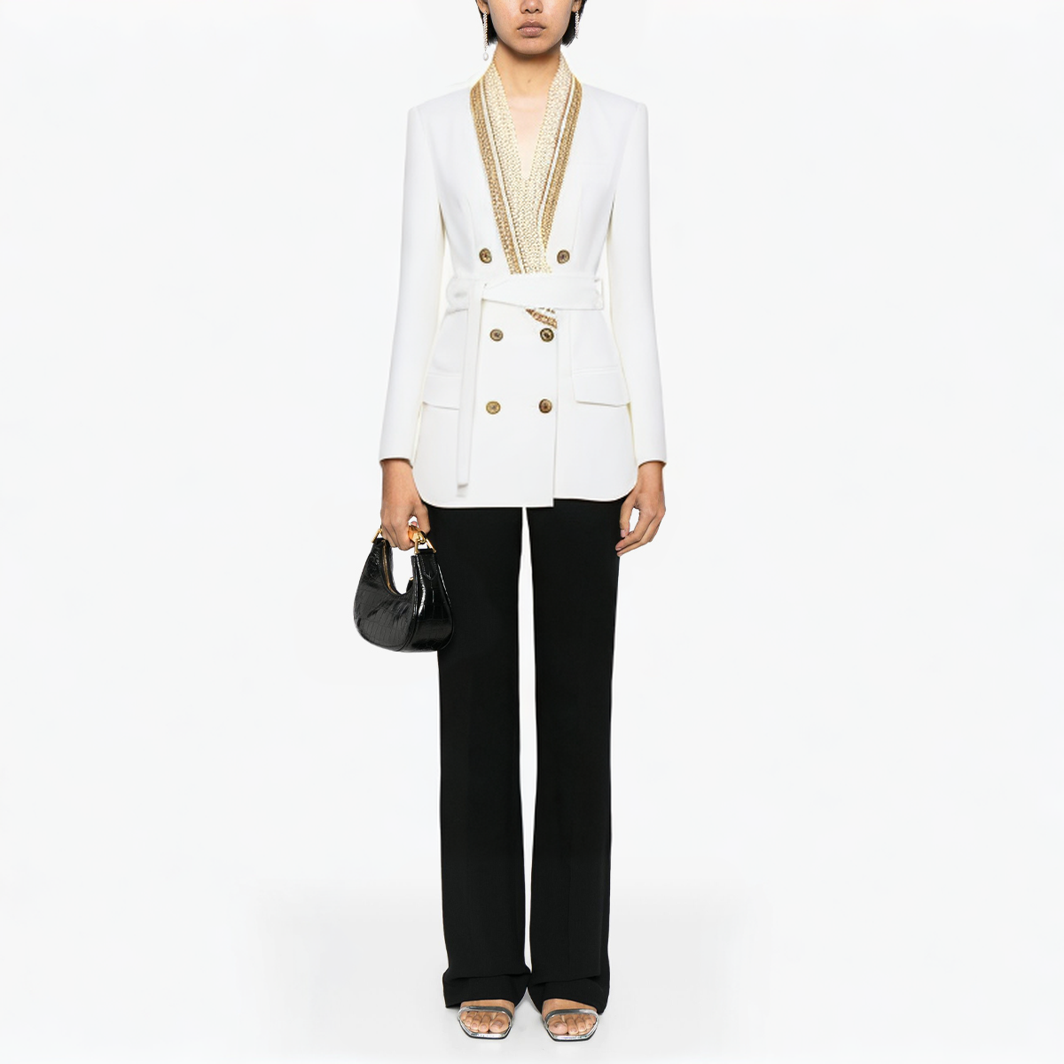 This autumn and winter exquisite diamond V-neck women’s jacket is made of high-quality worsted fabric, combining the excellent properties of polyester and cotton, which is warm and comfortable, especially suitable for wearing in cold seasons. The unique V-neck design is matched with exquisite diamond decoration, showing a luxurious temperament, exuding noble elegance in a low-key manner. The double-breasted design not only adds a sense of layering to the jacket, but also makes the overall shape more three-dimensional and stylish. Exquisite beads are decorated on the neckline and body, adding a sense of luxury to the overall jacket, perfectly interpreting the autumn and winter fashion trend.