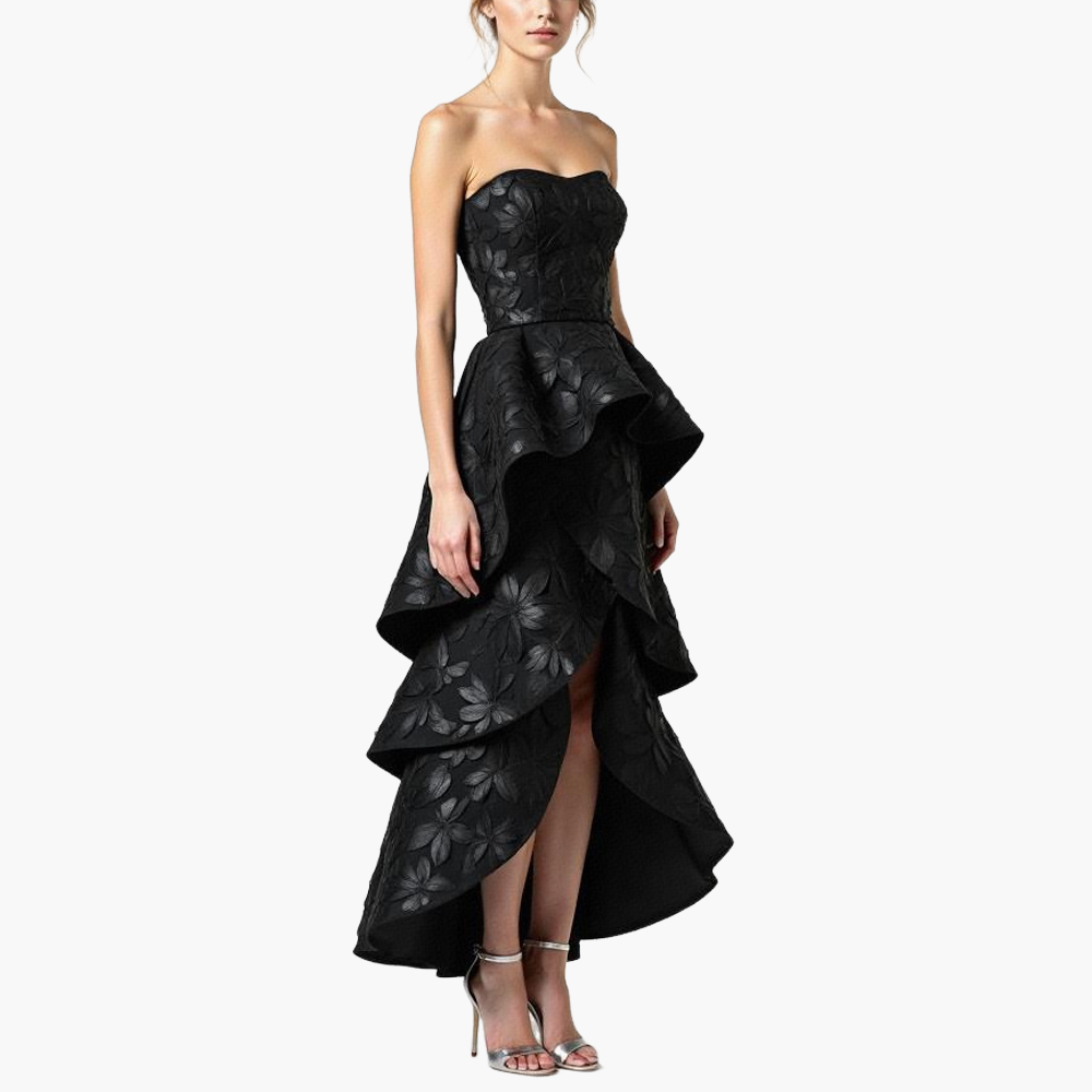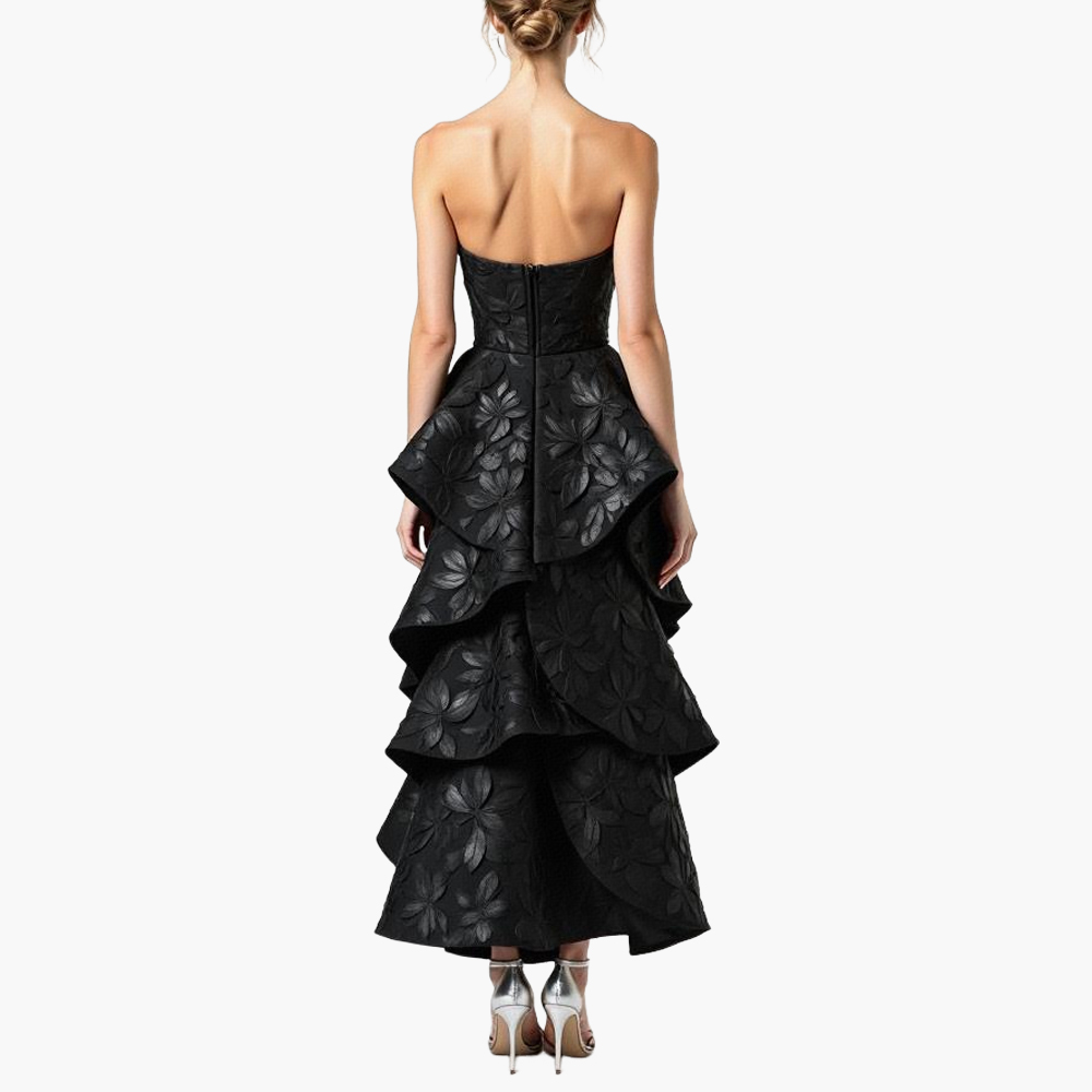 Black Leaf Decorated Tube Top Cascading High Slit Skirt
