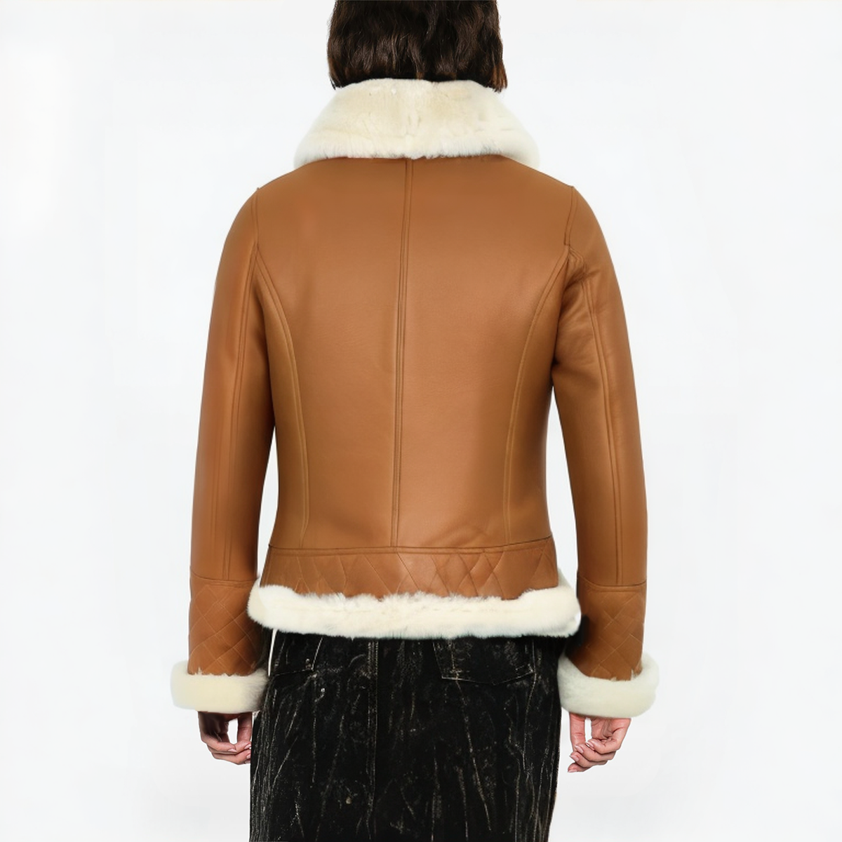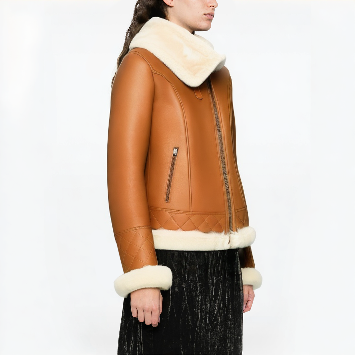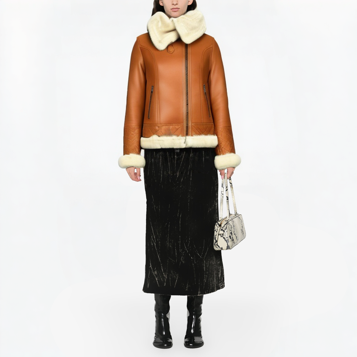 This bomber jacket uses soft and durable sheepskin as the outer material, which has natural waterproof properties and can effectively resist wind and rain, so that you can stay dry and warm in cold seasons. The design of the jacket is inspired by the classic ranch pilot style, combined with the slimming needs of modern women, to create a coat that is both fashionable and practical. The lapel notch design makes the overall look more layered, adding a touch of playfulness and elegance.