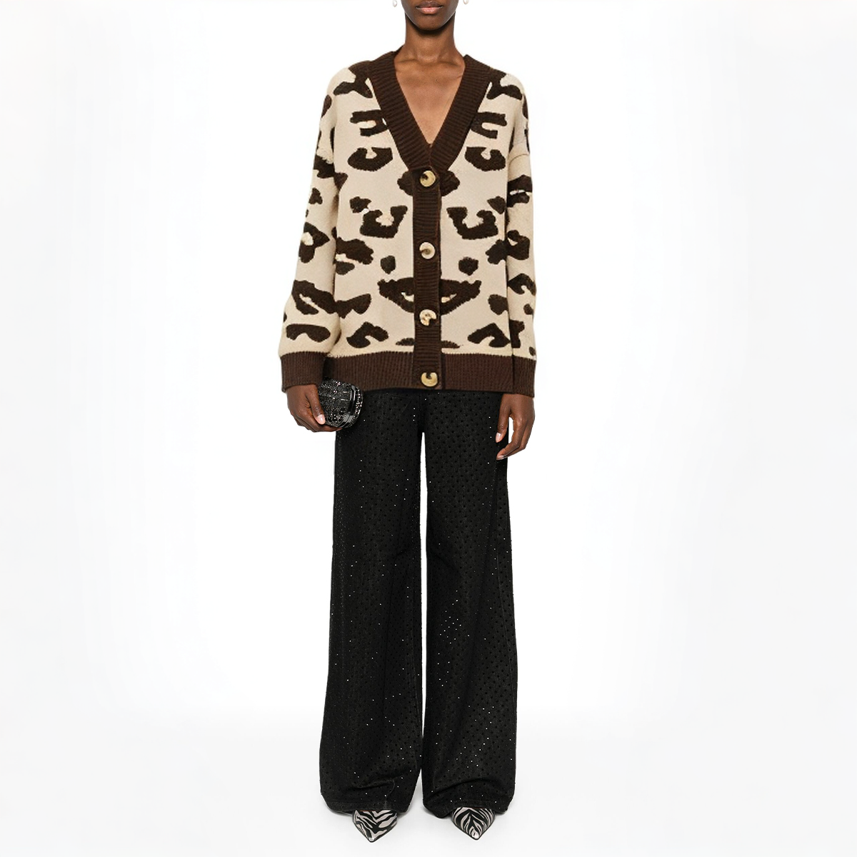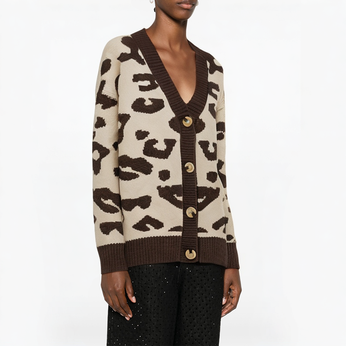 This stylish and casual V-neck button mid-length knitted leopard cardigan sweater combines modern and classic design elements. The leopard pattern adds wildness and fashion to the sweater, while the mid-length style brings elegance and casualness. The viscose and nylon blended fabric has good breathability, comfort and durability. The V-neck design can modify the neck line, showing the gentleness and charm of women, while the button placket provides convenience for wearing and taking off. Whether paired with jeans, skirts or other basic items, this cardigan jacket can easily create a fashionable and casual style for you, suitable for a variety of occasions.
