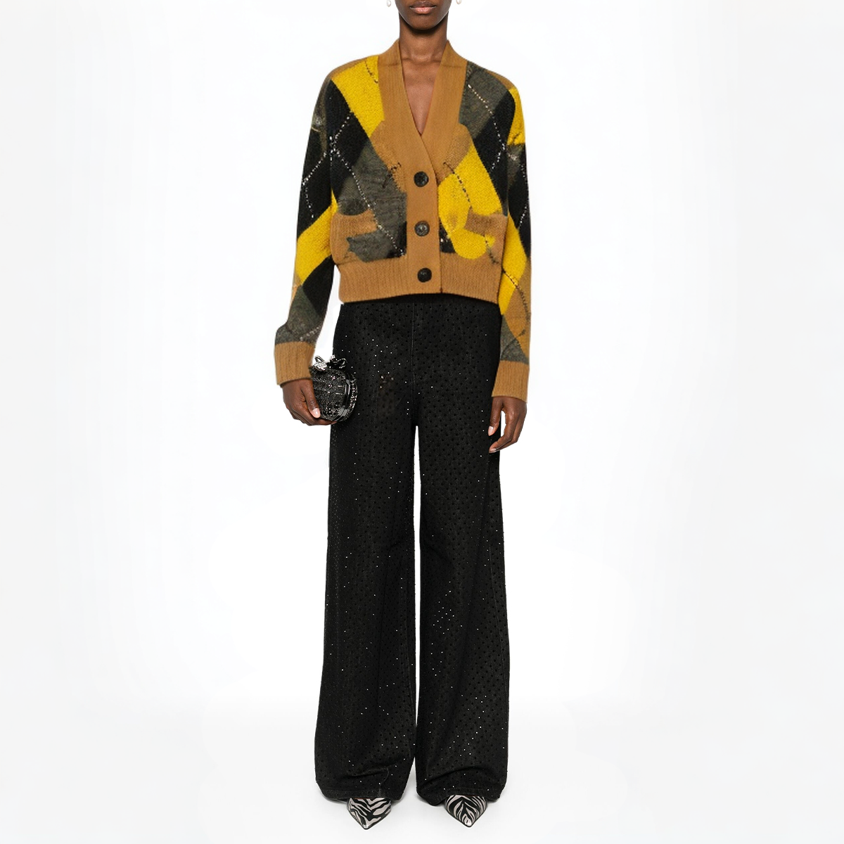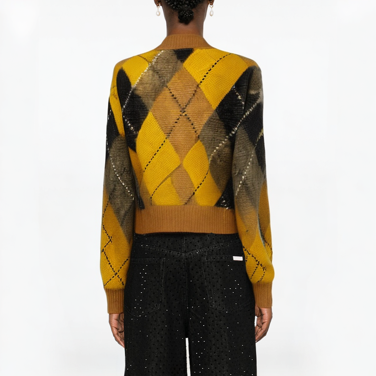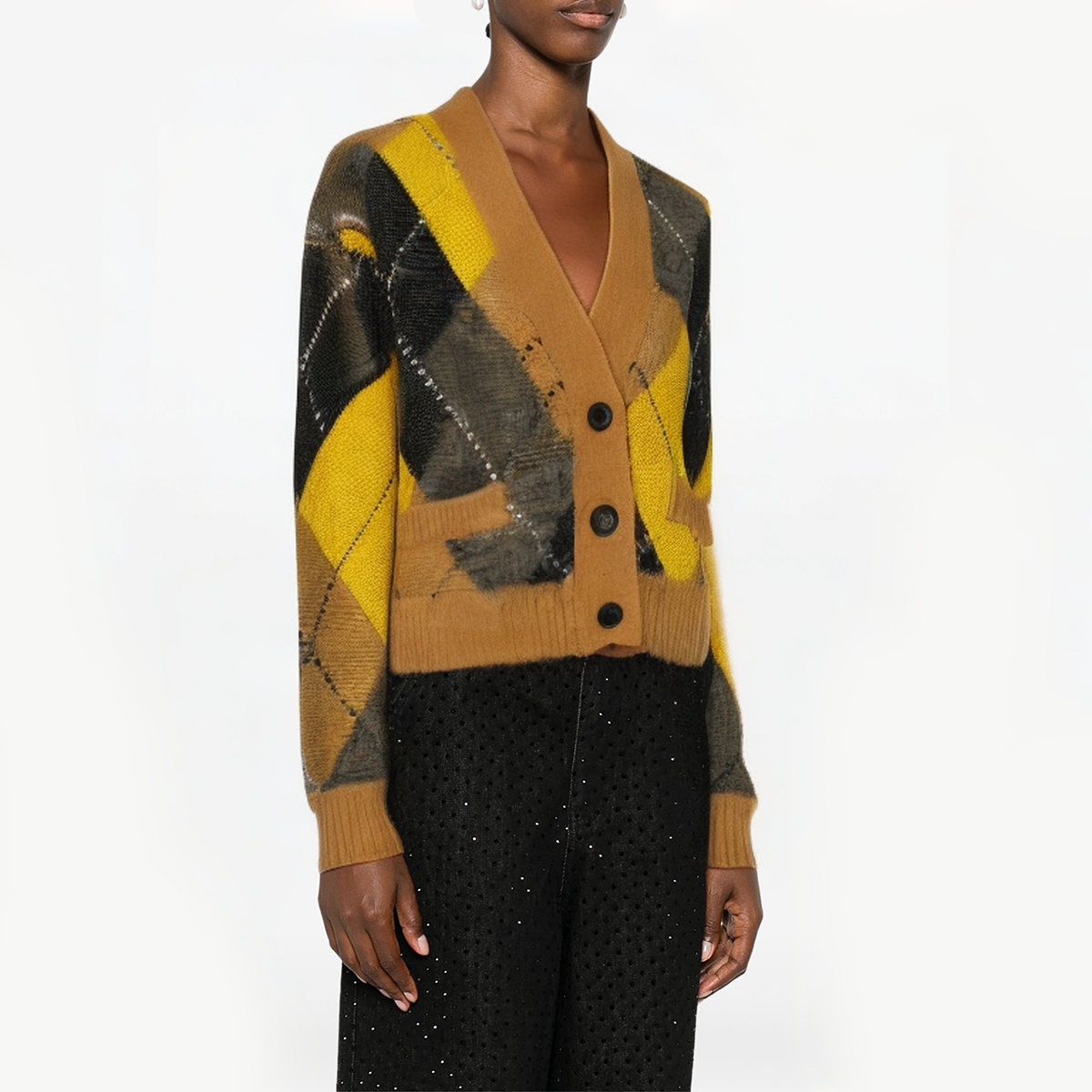 This geometric mohair women’s knitted top V-neck cardigan, with its unique Bohemian style and high-quality mohair fabric, brings a perfect combination of comfort and fashion. The soft texture and excellent warmth retention of mohair, combined with the geometric pattern design, show a modern visual effect. The V-neck design not only shows the elegant neck line of women, but also cleverly lengthens the body shape. The single-row button closure method is simple and neat, bringing a classic beauty. It is suitable for daily wear and can be matched with various occasions, showing the wearer’s unique personality and taste.
