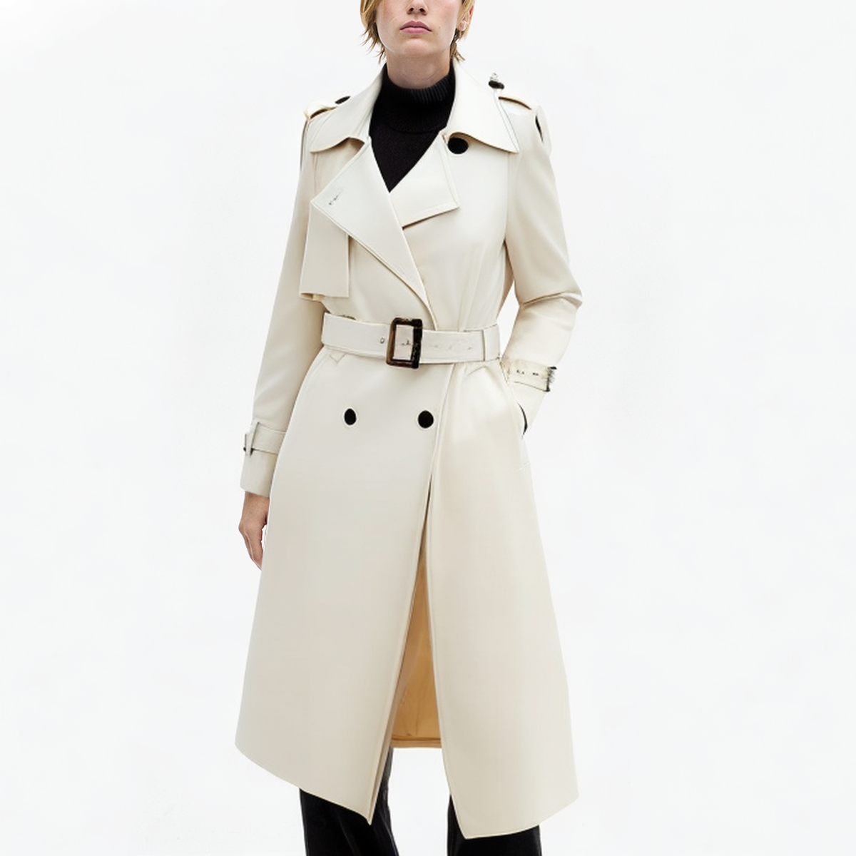 • Lapel notch collar: The classic lapel design is combined with the unique notch design. The lapel adds a bit of elegance and competence to the trench coat, while the notch breaks the traditional single design, making the overall style more fashionable and personalized.