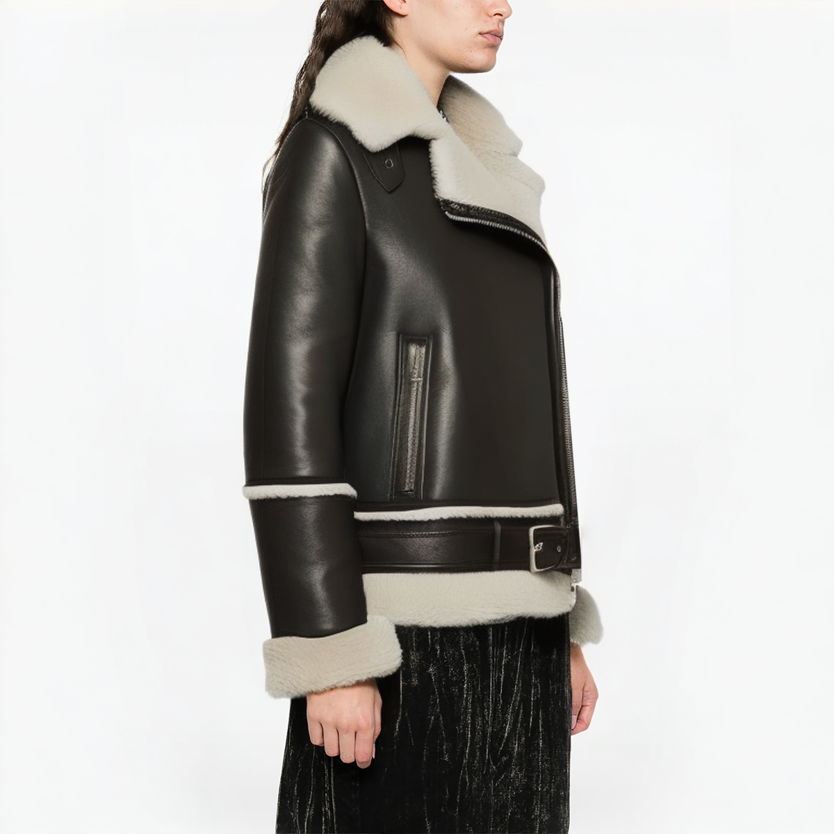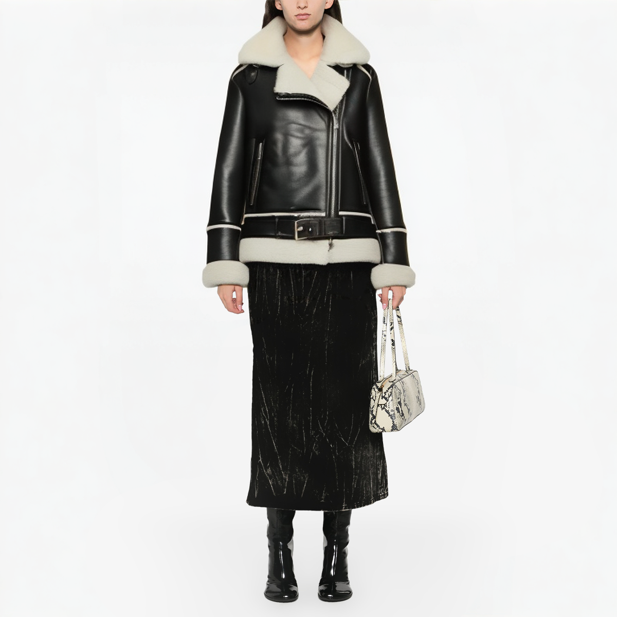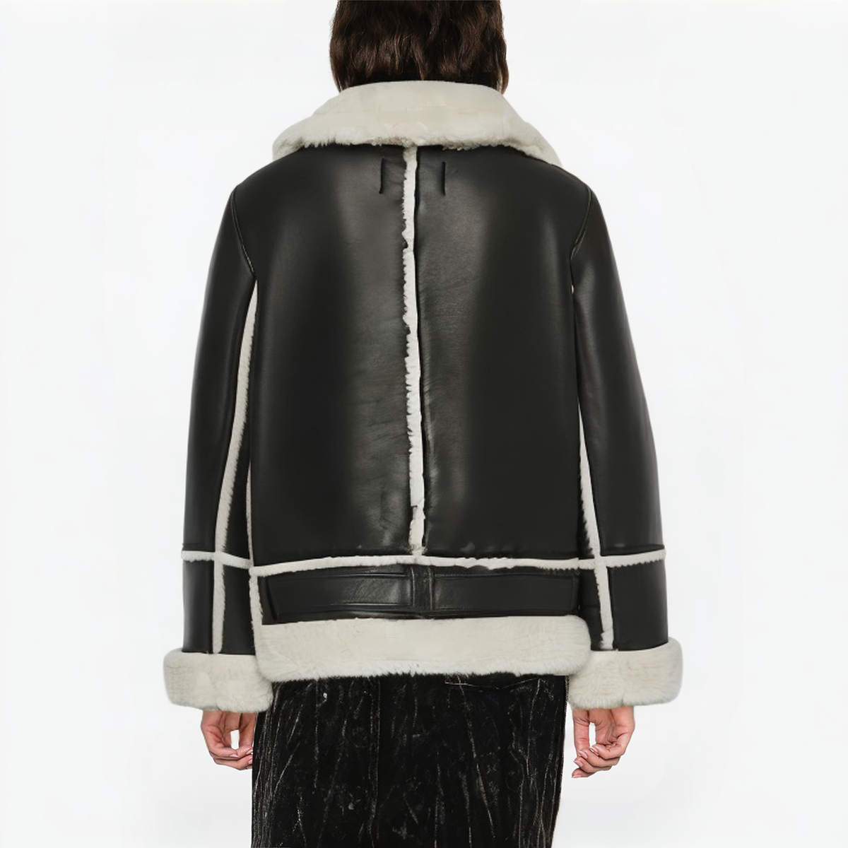 The outer layer of the jacket is made of selected sheepskin leather, which is soft and durable, with natural cold resistance and wind resistance, suitable for wearing in severe winter. The large lapel design adds a sense of layering to the jacket and can effectively protect the neck from the cold. The unique lapel notch design not only adds a sense of fashion, but also makes the overall appearance more avant-garde and three-dimensional.