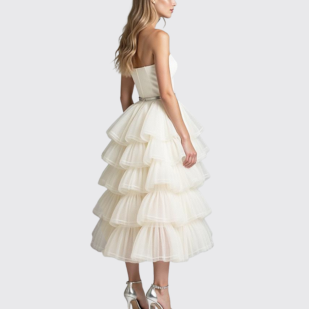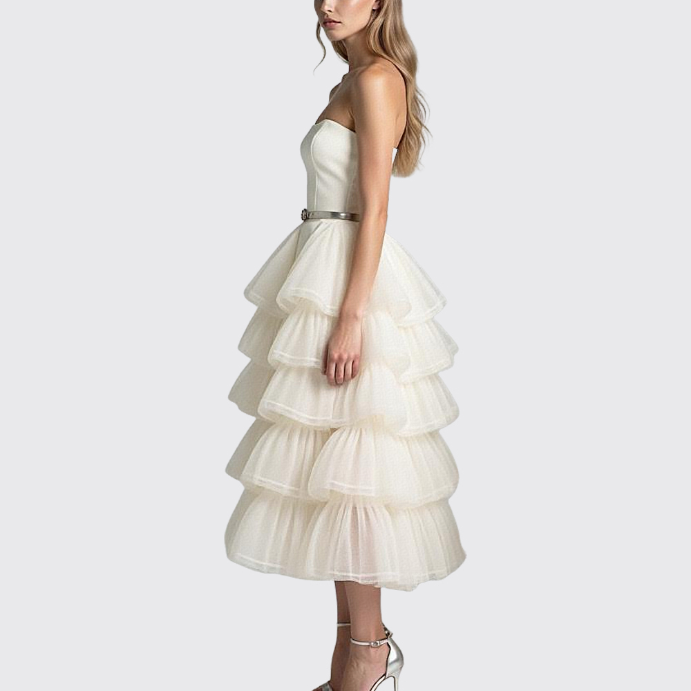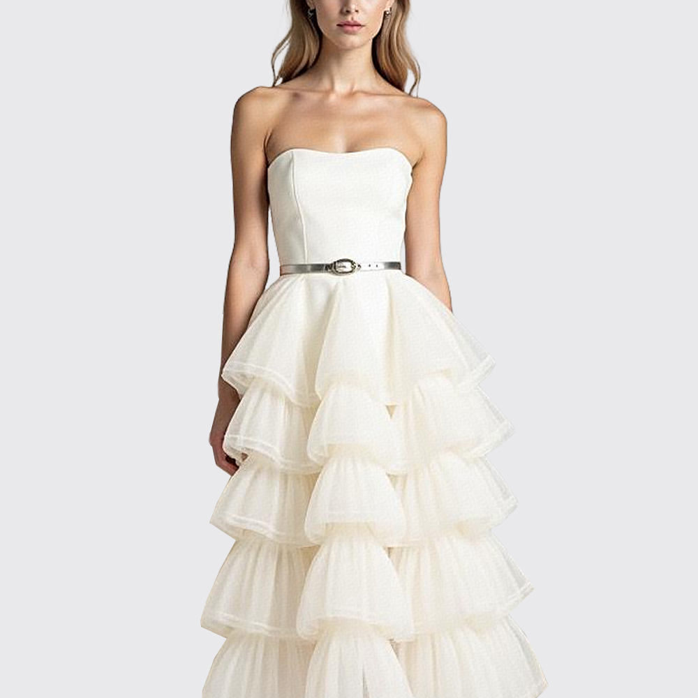 Tiered tulle skirt adds a playful and romantic vibe. Comes with a detachable silver – tone belt to accentuate the waist.