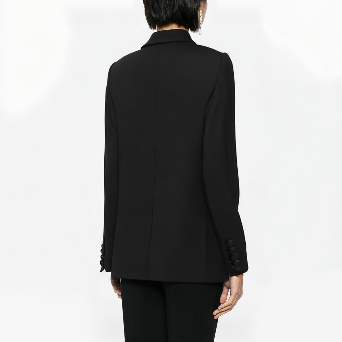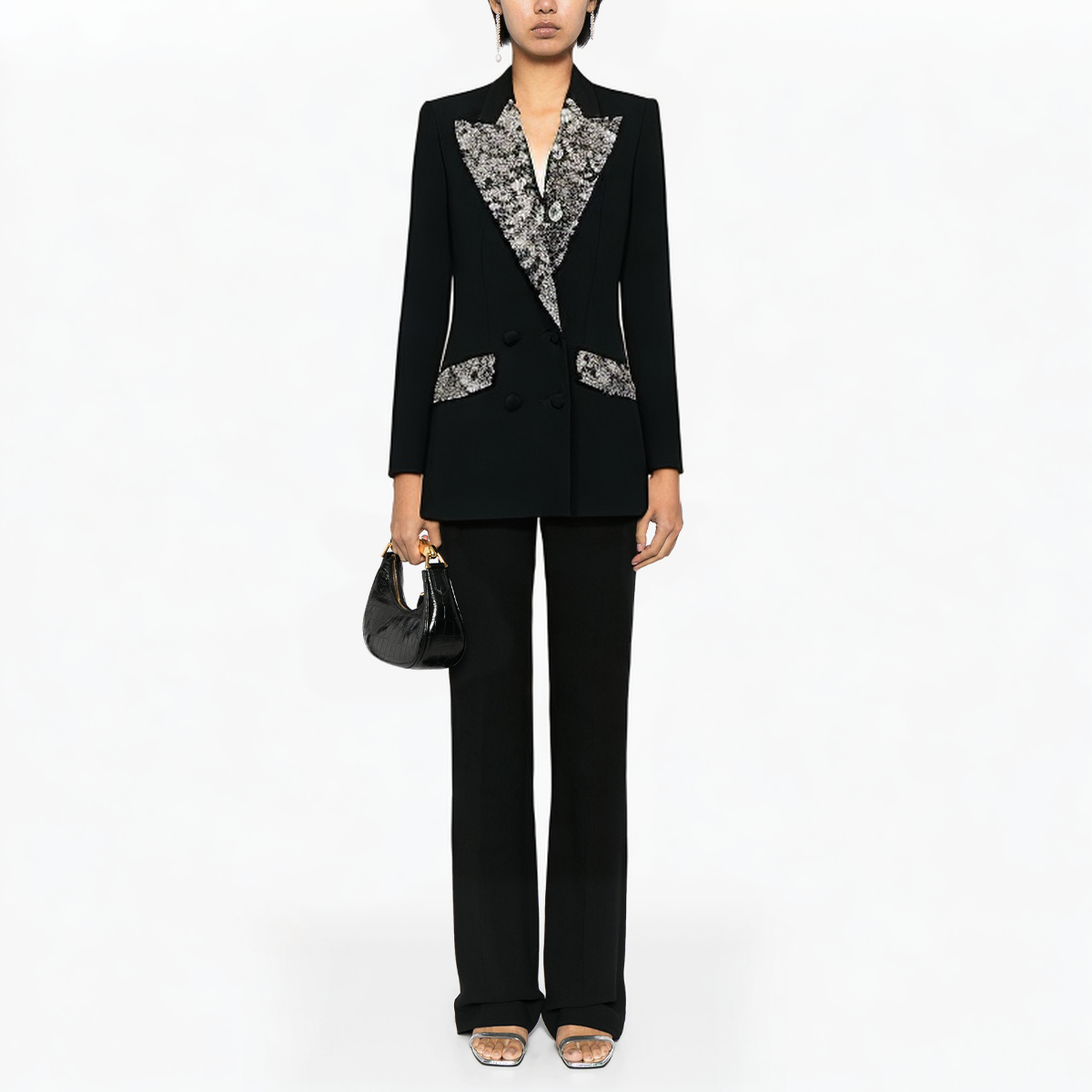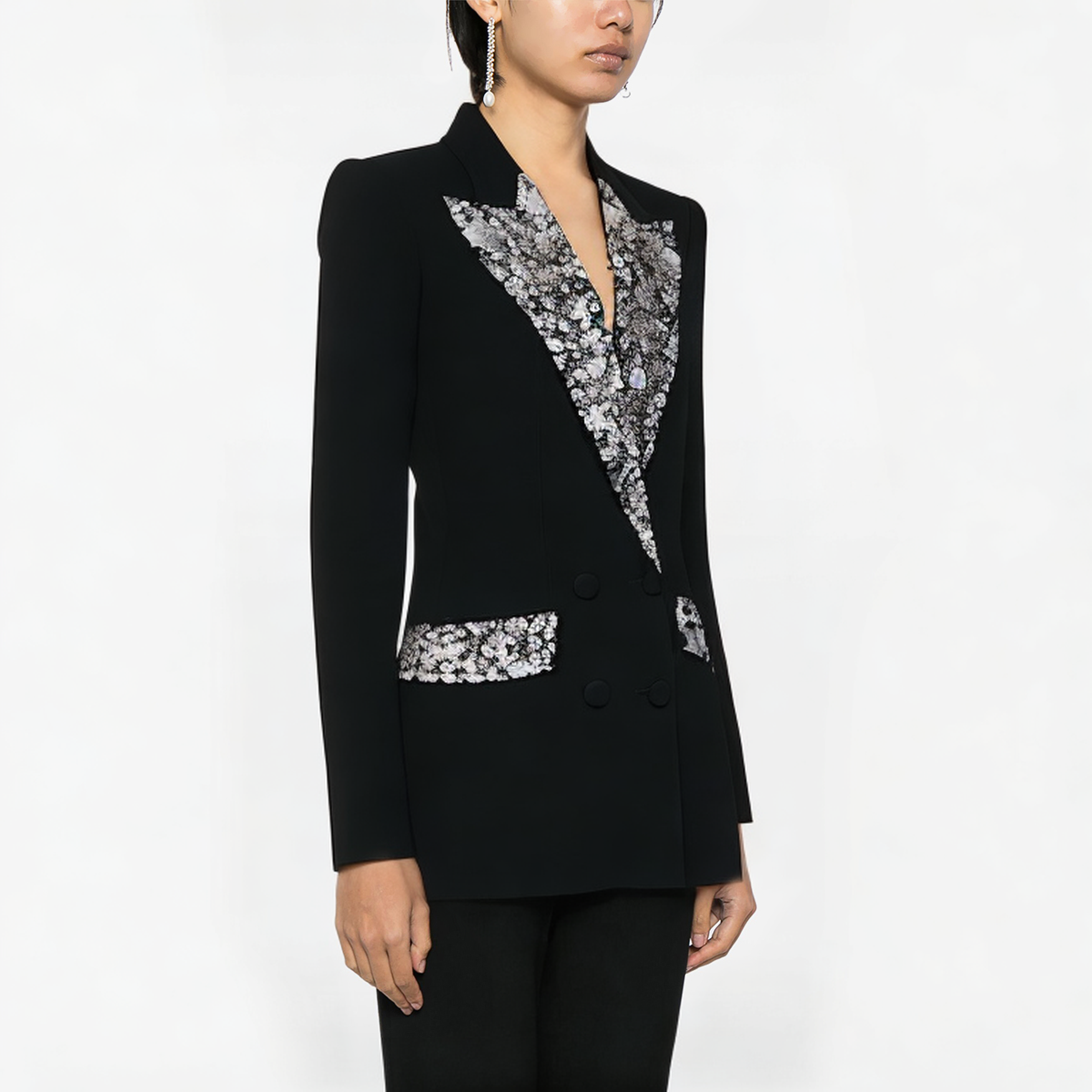 This stylish mid-length women’s suit jacket exudes extraordinary elegance with its unique design and exquisite rhinestone decoration. Made of high-quality polyester fabric, it has excellent durability and comfort, and is shrink-proof to ensure the long-term use of the jacket. The classic double-breasted design is combined with exquisite lapel notches to bring a perfect fusion of modernity and classic elegance. The delicate rhinestone decoration is embellished on the lapel part, adding a touch of luxury, making the whole jacket look more refined and layered.