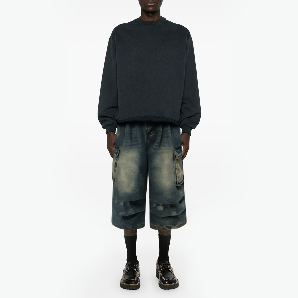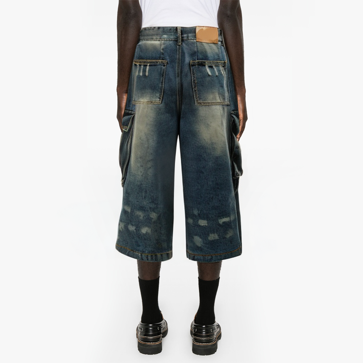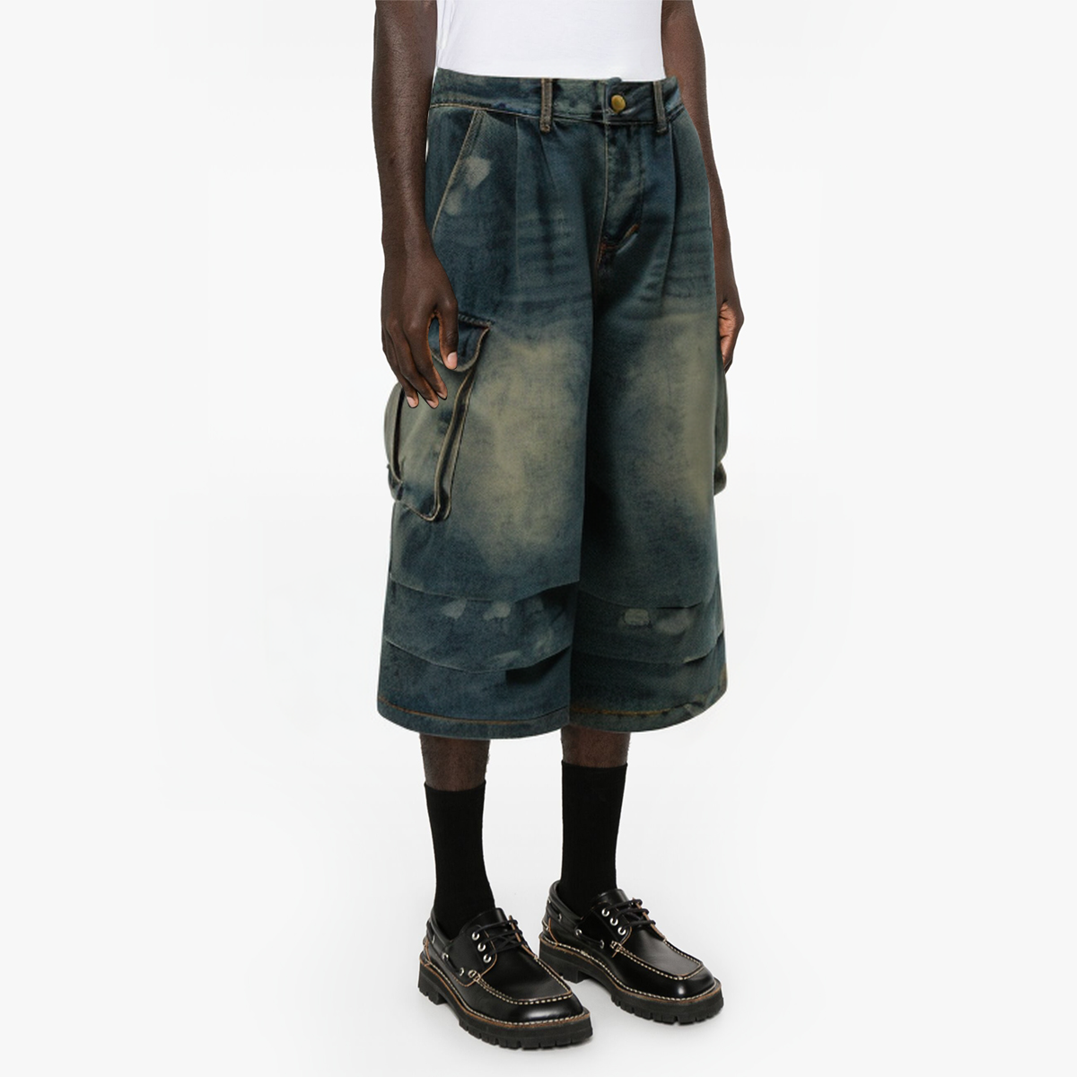 This pair of men’s denim shorts has a unique pleated design and washed treatment, showing the charm of combining fashion and retro. The large pockets on both sides not only enhance the practicality of the shorts, but also give it a tougher workwear style. Whether it is daily wear or outdoor activities, it can bring you comfort and fashion.