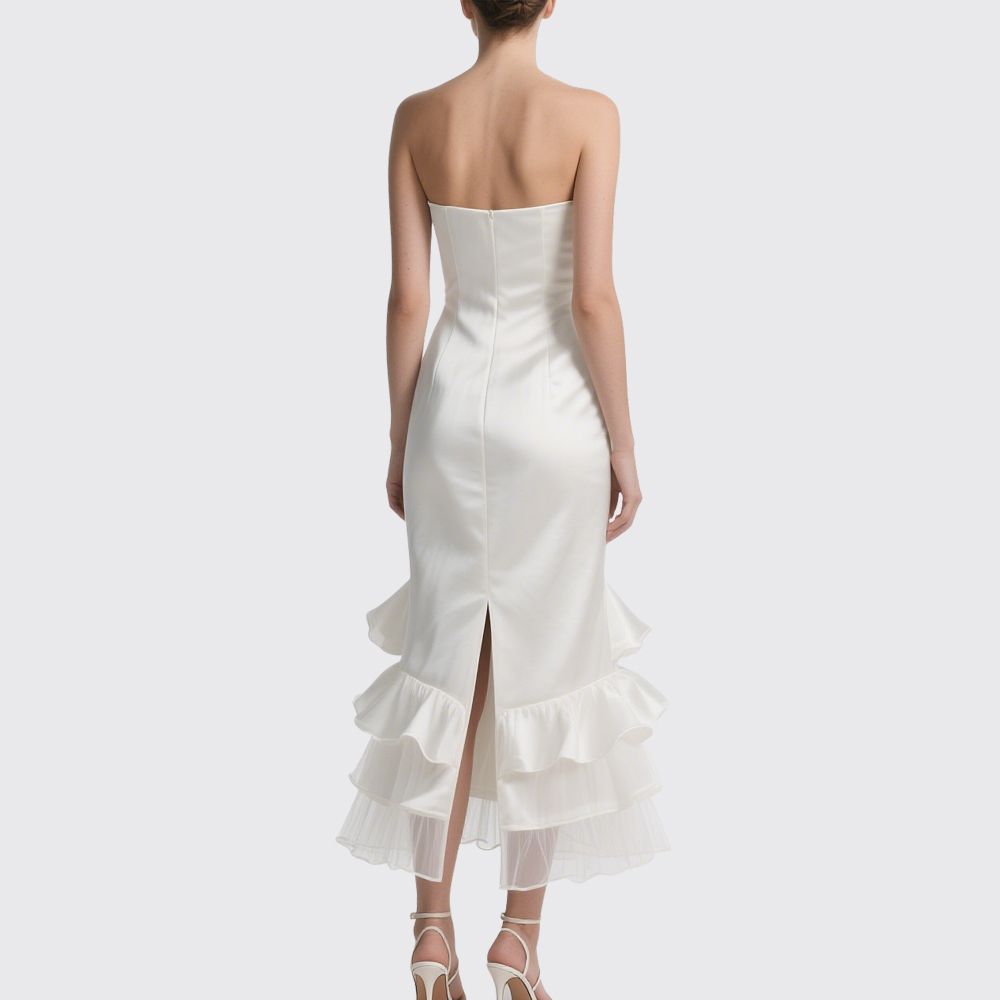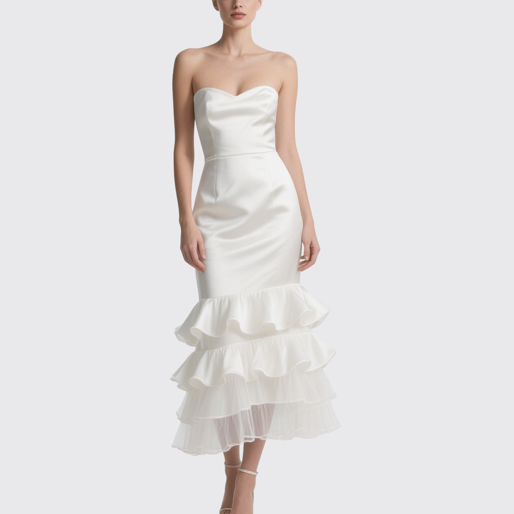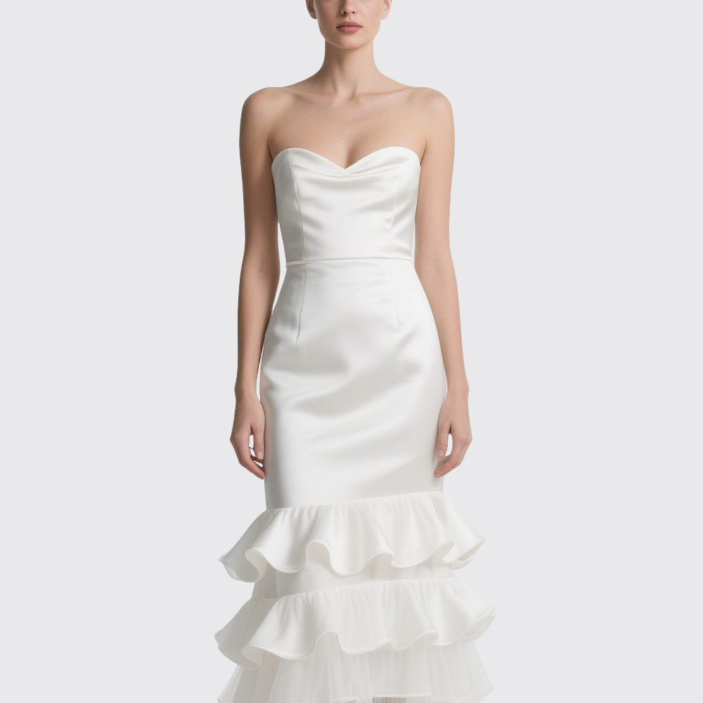 Strapless sweetheart neckline for an elegant, romantic vibe. Fitted silhouette through the hips, finishing with tiered ruffle tulle for a playful – yet – polished look.