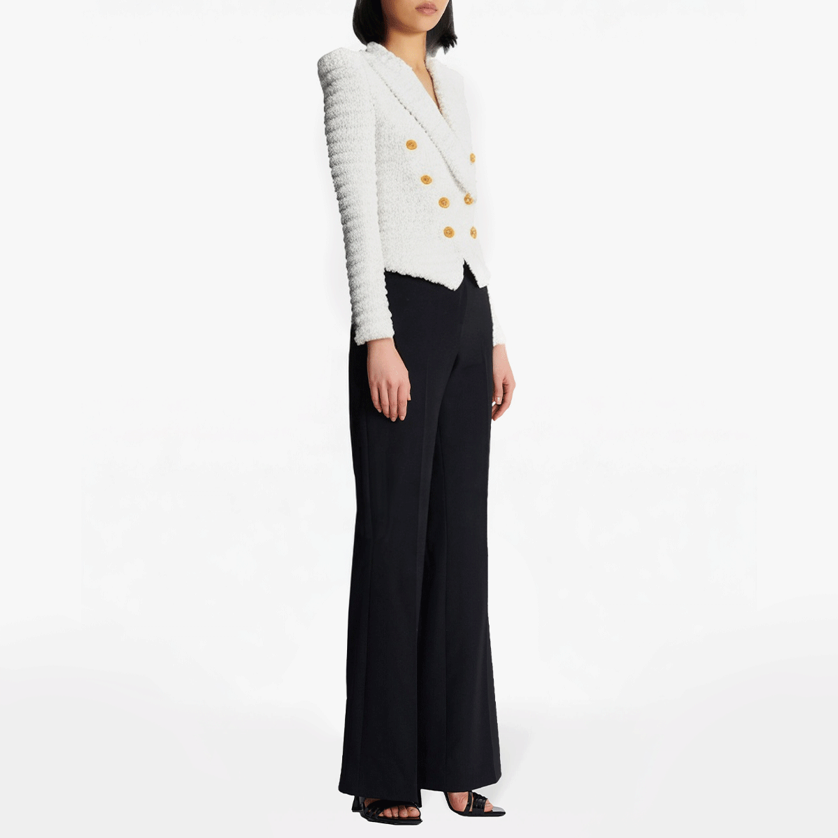 This white winter tweed coat, with its elegant slim fit and classic double-breasted design, shows the taste and unique charm of exquisite women. The fabric is a blend of polyester and wool, which ensures warmth and comfort, and is very suitable for office and formal occasions in autumn and winter. Its shrink-proof properties ensure that the original elegant outline is maintained for a long time after wearing. Whether it is paired with professional attire or daily wear, it can make you look decent and fashionable in different occasions.