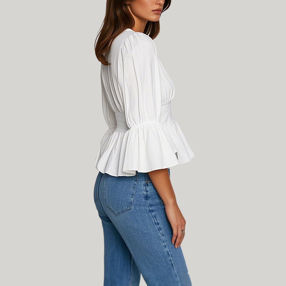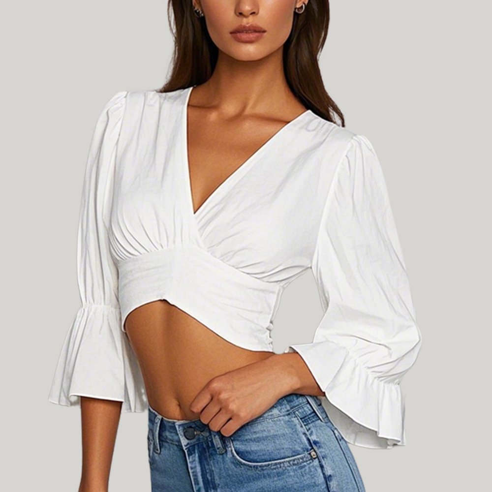 We love this top, it works perfectly for both dressy and casual looks. Cropped cut.