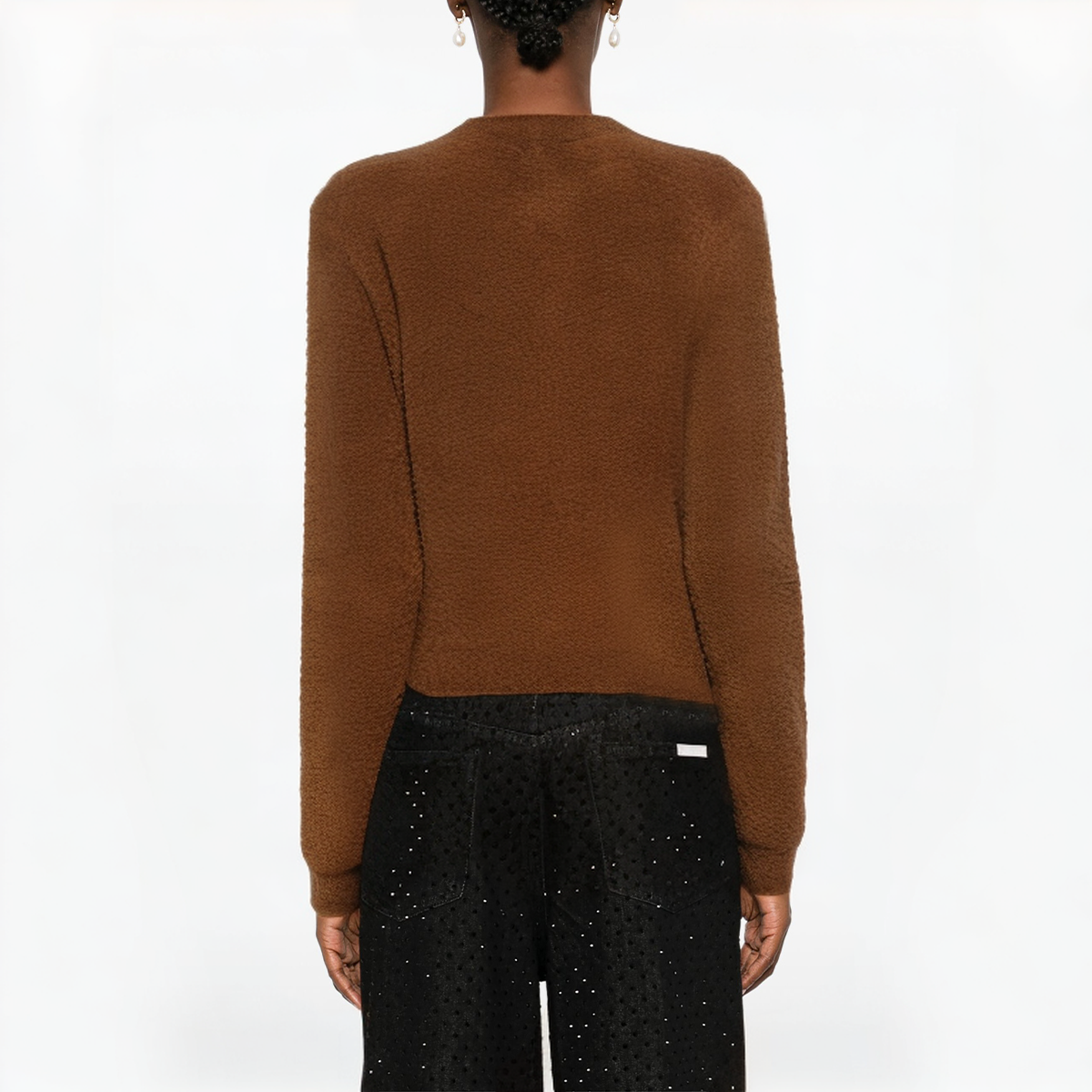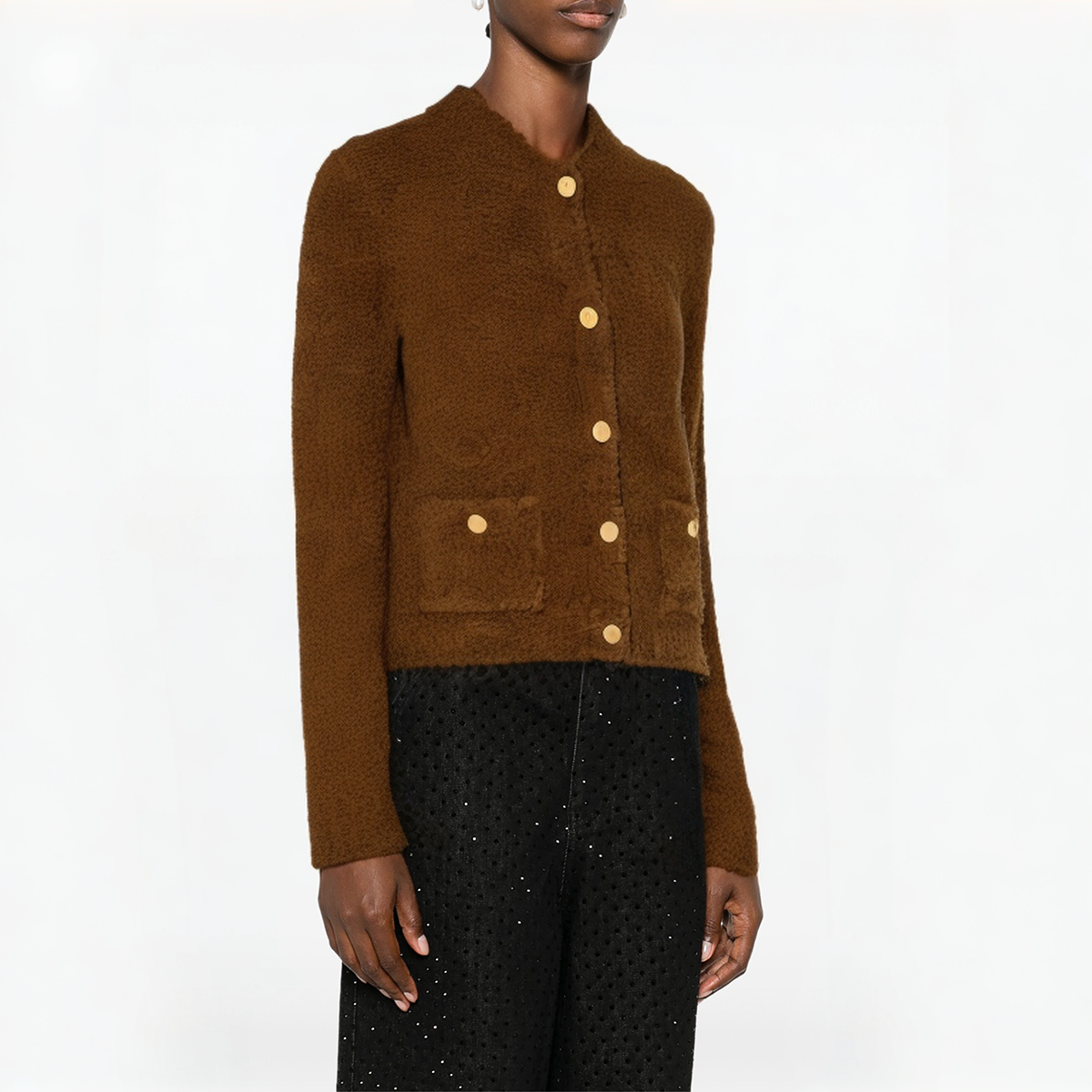 This autumn and winter brown round-neck long-sleeved knitted cardigan is made of high-quality wool and acrylic blended fabrics, which brings a comfortable wearing experience and appropriate warmth. The classic round neck design is combined with the exquisite single-row button placket, which is simple and elegant. The pocket design on both sides is not only practical, but also adds a touch of leisure to the overall look, which is convenient for storing small items, while adding a bit of leisure and fashion. Suitable for daily wear or as a coat, the brown tone also makes it more warm in the autumn and winter seasons, and it can be easily matched with various inner wear to create a layered look.