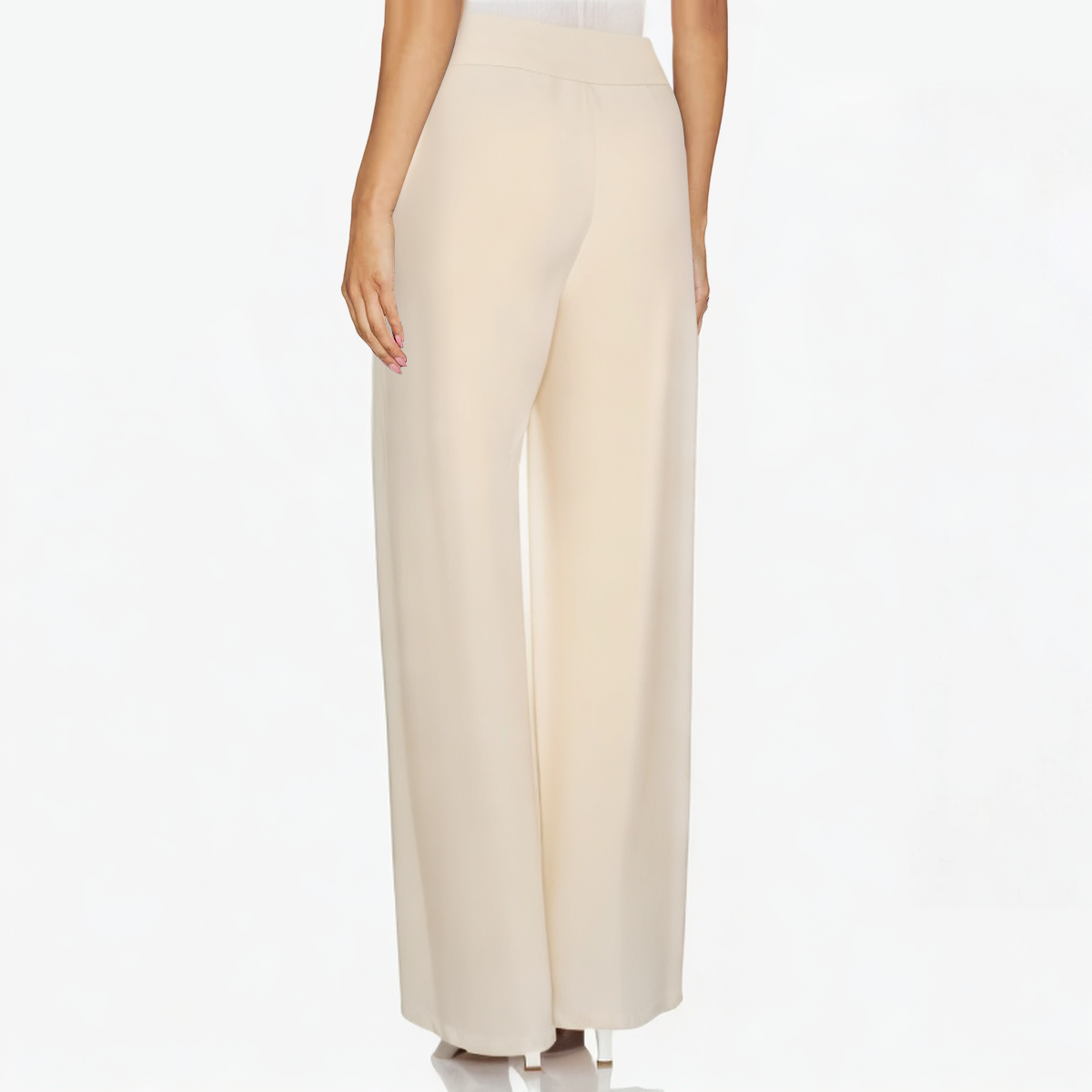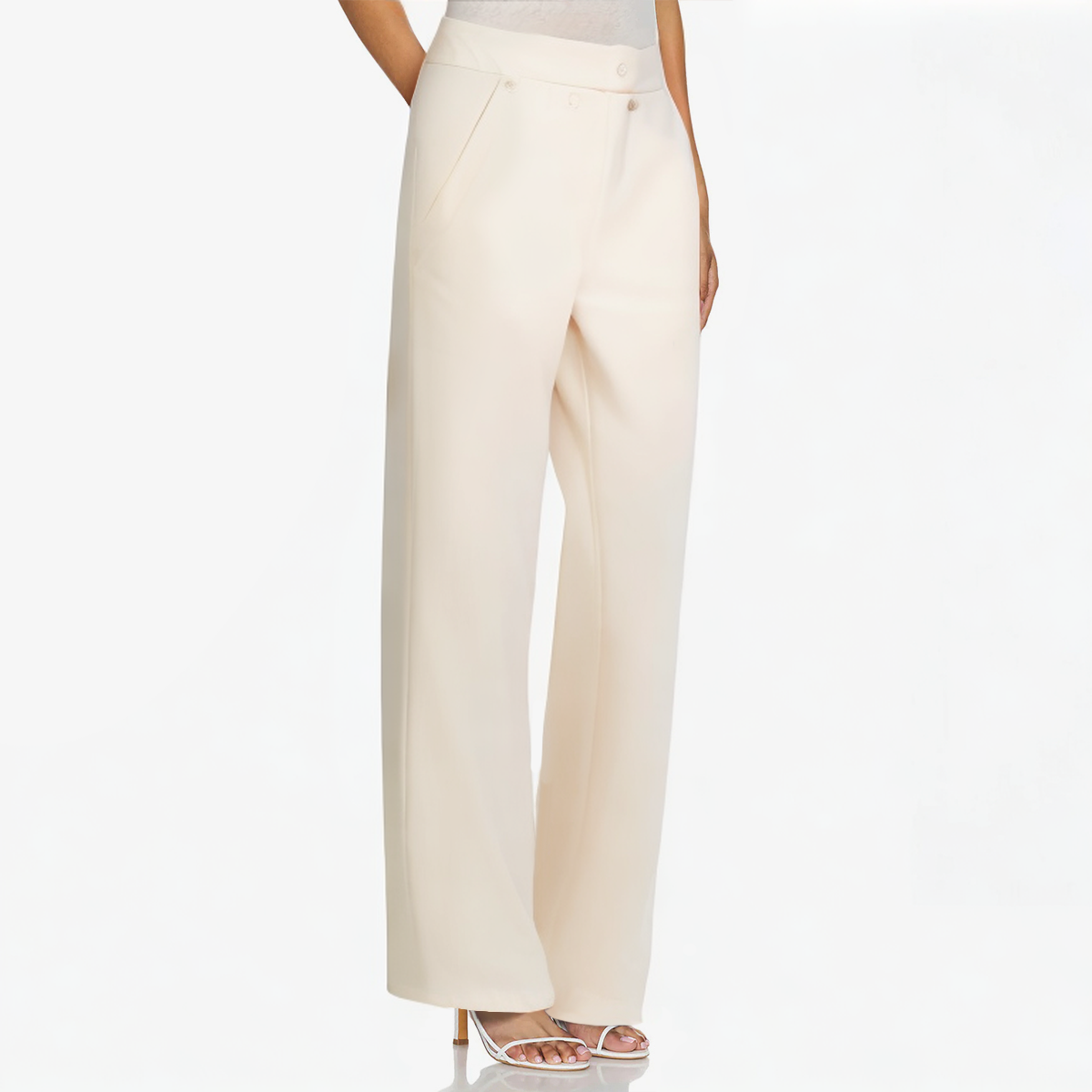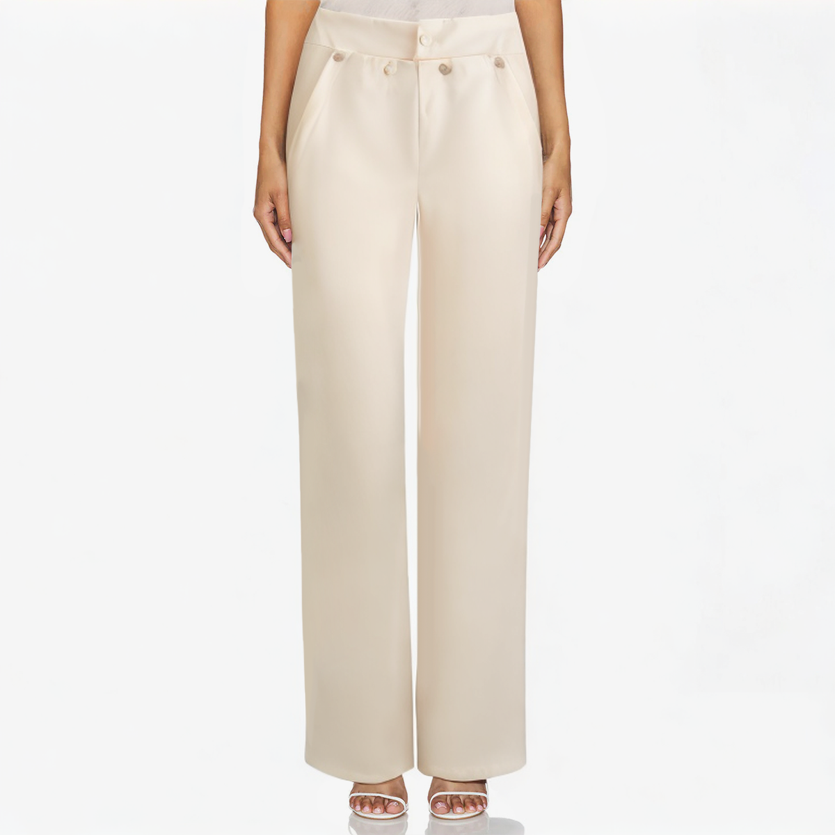 This beige women’s trousers adopts a classic wide-leg design, combining modern and retro elements, showing a chic sense of fashion and elegance. The trousers are made of 100% polyester fabric, and the woven material has good breathability, which is suitable for spring and summer. It is comfortable and breathable, ensuring the comfort of all-day wear. The unique wide-leg design not only modifies the leg shape and shows smooth lines, but also provides comfortable space for activities. There are four buttons on the front waist of the trousers as decoration, adding a sense of detail and retro style to the overall shape. The zipper placket design makes it easier to put on and take off, while adding a modern feel to the trousers. The flat design on the front makes this trousers look simple and generous, suitable for all occasions, and perfectly combines casual and formal styles.