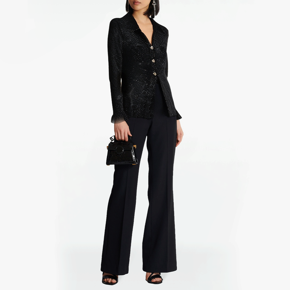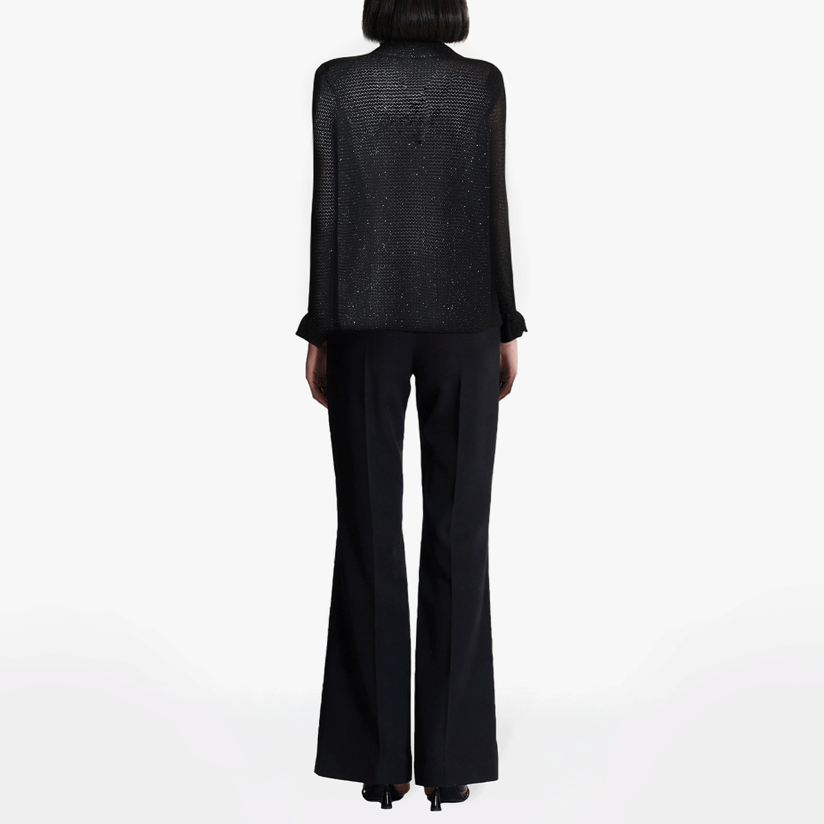 This black glitter knitted cardigan is both elegant and fashionable. It is designed for spring and summer and is suitable for all kinds of formal and casual occasions. The exquisite lapel design combined with the single-breasted details shows the unique charm of elegant women. It adopts highly elastic viscose fabric, which is comfortable and breathable, can effectively regulate temperature and maintain comfort. The glitter material adds a touch of exquisite luster to the whole, making it suitable for daily office wear and can be easily transformed into a fashionable item for evening outings or parties. The full sleeve design makes it more suitable for transitional seasons, which not only maintains warmth but also lightness.