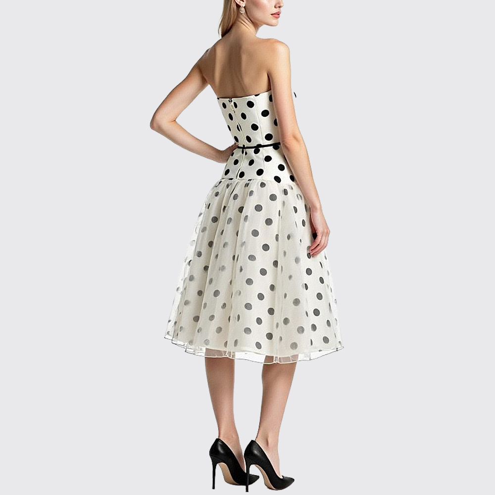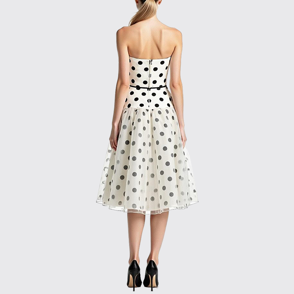 Strapless silhouette highlights shoulders. Contrast polka – dot patterns (black on bodice, beige on tulle) create a playful, layered look. Midi length balances elegance & fun.