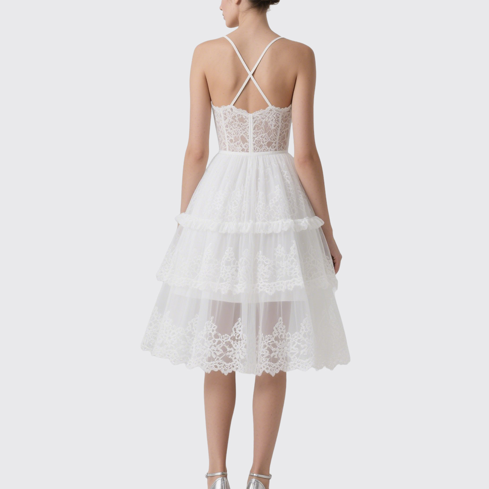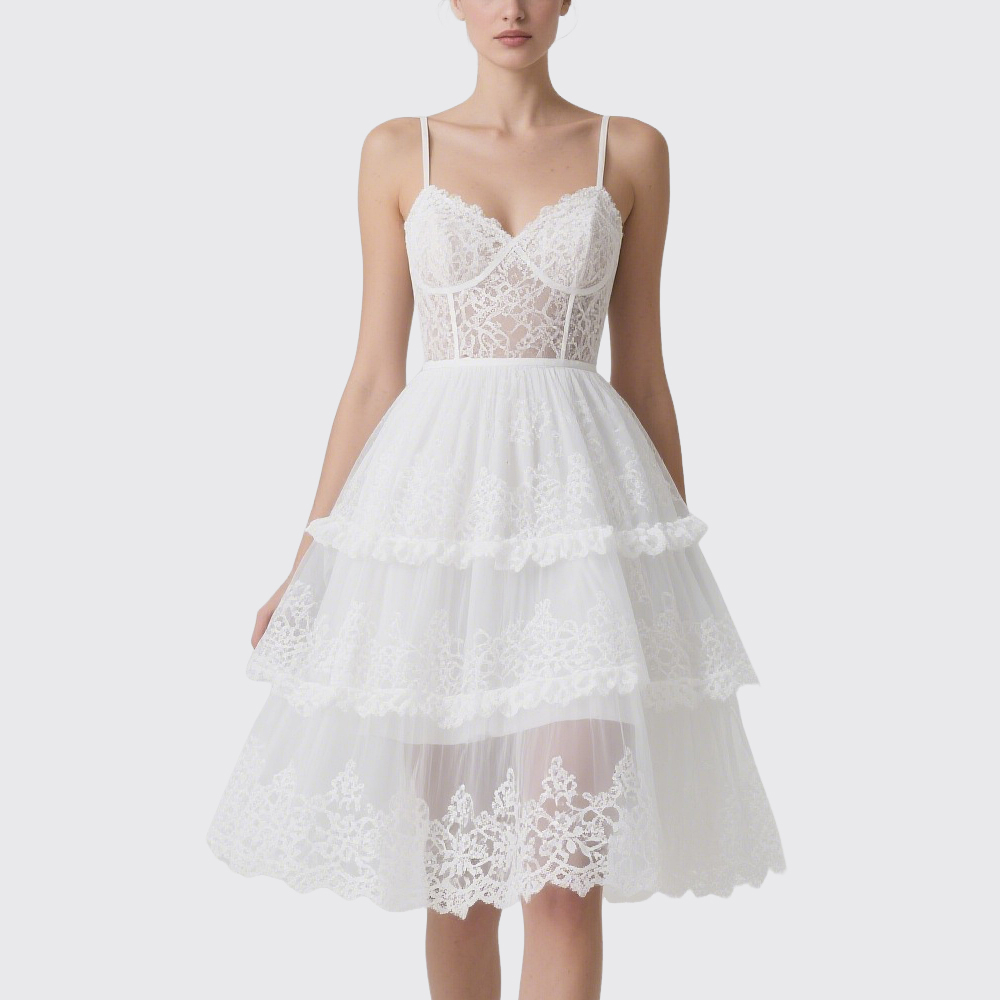 Tiered Tulle Skirt: Flowy, tiered tulle skirt with lace trim creates movement and a feminine, bridal – worthy silhouette.